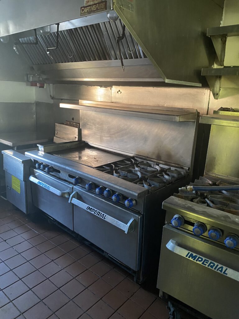 Full cooking line under the hood, Walk-in Refrigerator. Freezer, Refrigerators, Refrigerated Prep Tables, Stainless Tables, Dish Washer, Counters, Ice Machine, dining Area Tables and Chairs.
